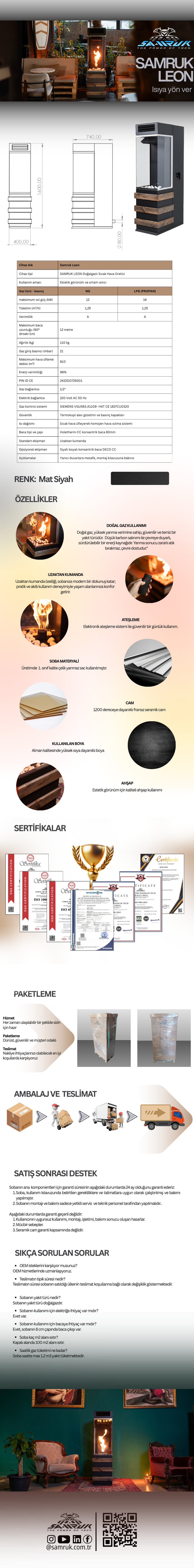 Samruk Leon Modern yaşam alanları için özel olarak üretilen doğalgazlı sıcak hava üretici şömine, hem dekoratif şömine estetiğini hem de güçlü sıcak hava üretim teknolojisini tek bir sistemde birleştirir. Yüksek ısı verimliliği sayesinde konut, villa, kafe, restoran ve ticari alanlarda ekonomik ve çevreci ısınma sağlar.